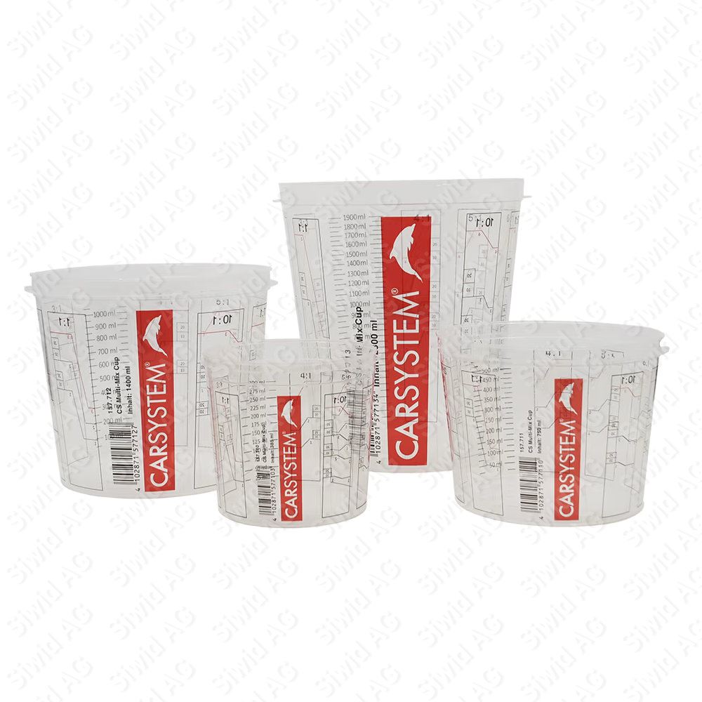 Die Carsystem Multi Mix Cup 2.0 sind Einweg - Mischbecher mit separat erhältlichen Deckeln und aufgedruckten Mischungsskalen zum sauberen und exakten Anmischen aller Lackmaterialien.