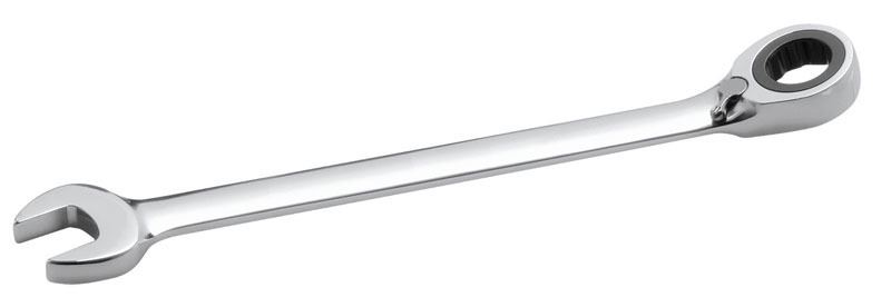 Ratschenschlüssel mit Umschalthebel. Die Drehrichtung kann einfach am Hebel umgeschaltet werdem. Im Ringteil verhindert ein Bördelrand (Cap-Stop) das Durchrutschen und sitzt immer auf der Mutter/Schraube auf. Das ist sehr hilfreich bei Gewindestangen- und Bolzenverschraubungen. Maulstellung und Ratschenkopf sind jeweils um 15° gekröpft. Fein verzahnt für kleinsten Rückholwinkel. Kompakte Bauform in Ganzstahl-Ausführung, vernickelt, verchromt und hochglanzpoliert.