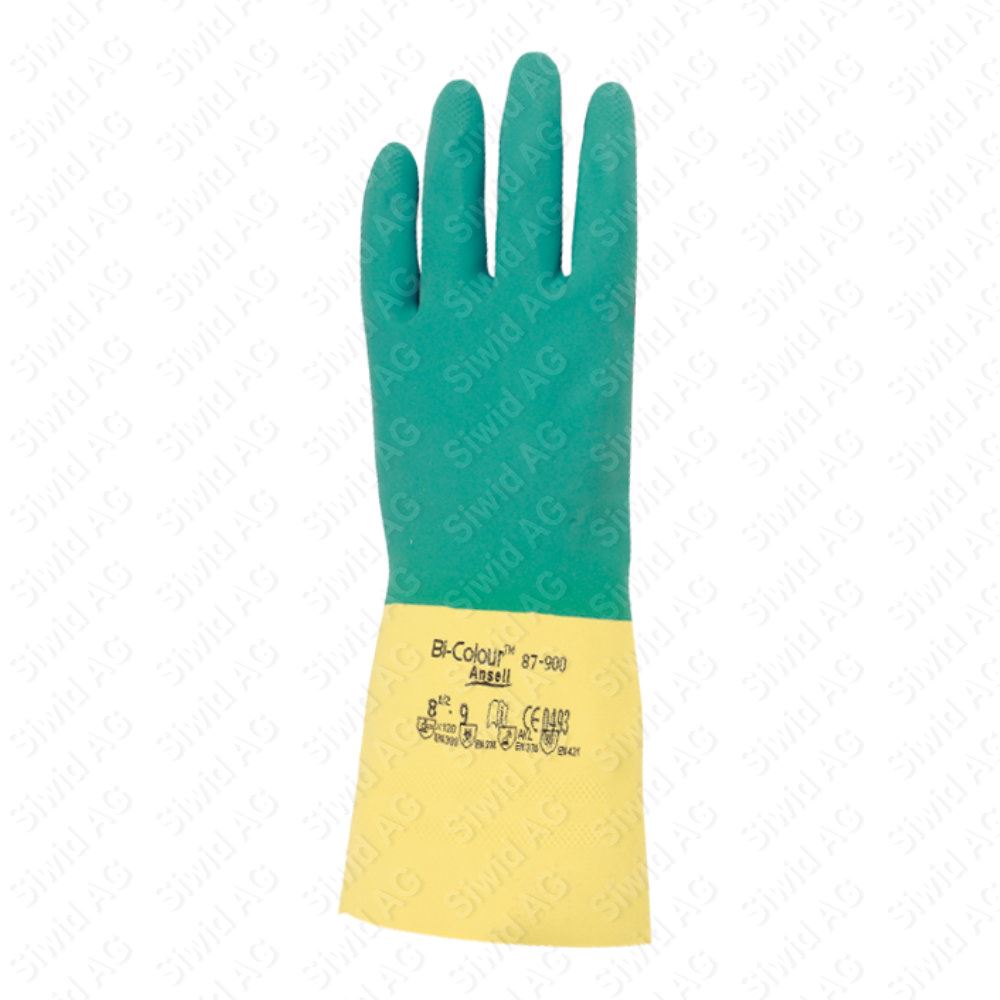 Schutzhandschuhe ANSELL aus Naturlatex mit Neoprene-Überzug, zweifarbig grün/gelb, Wandstärke 0,7 mm, rutschsicheres Profil, innenseitig velourisiert, Länge 32 cm
