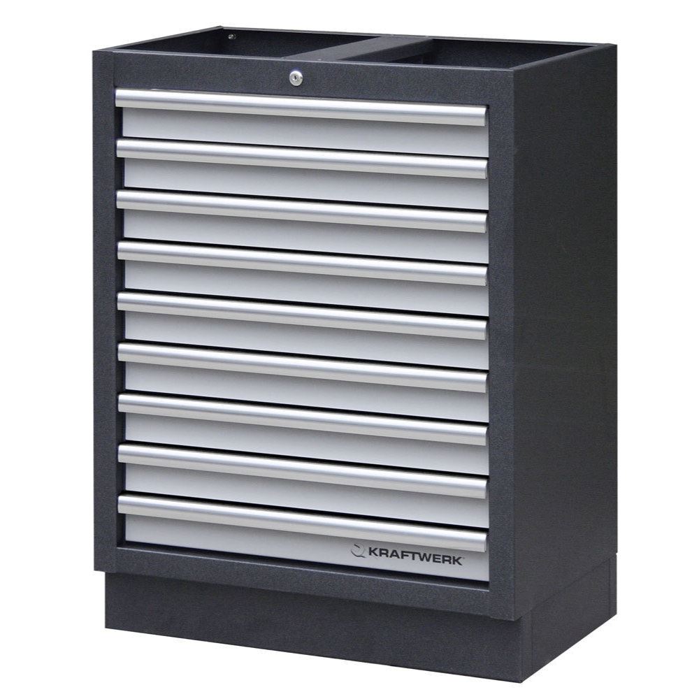Unterbauschrank mit 9 Schubladen aus dem modularem Element-Werkstatt-Schrankwand-System MOBILIO von Kraftwerk. Die kugelgelagerten Schubladen sind einzeln verriegelbar und zentral abschließbar. Passend für alle Kraftwerk Werkzeugeinlagen (COMPLETO Hartschalen, EVA und EVA3). Die Lieferung erfolgt fertig montiert, ohne Arbeitsplatte.