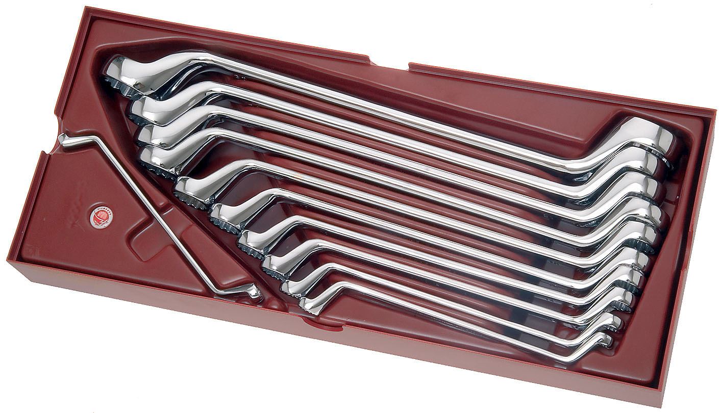 Kraftwerk COMPLETO Serie 4900 Einlegeschale mit 11 Doppelringschlüssel von Schlüsselweite 6x7 bis 30x32 mm. Jeder Doppelringschlüssel ist sauber und präzise gearbeitet und mit der Schlüsselweite und dem Hersteller versehen. Aus Chrom-Vanadium-Stahl, verchromt und hochglanzpoliert. DIN 838 / ISO 1085, 3318, 10104.