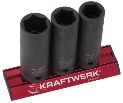Satz mit 3 langen Schlag-Stecknüssen auf magnetischer Aluminium-Stecknuss-Schiene. Diese ist leicht und kompakt sowie korrosionsbeständig. Die Stecknüsse sind griffbereit aufgereiht und die Schiene kann einfach zum Einsatzort mitgenommen werden und haftet auf metallischen Untergrund.